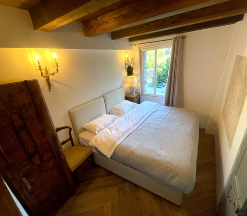 2 singles or one King bed with the perfectly framed mountain view. In this bedroom you will find an exposed square of the original hand-printed wall paper.